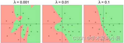 惩罚力度过小(左图),导致的结果是过拟合,有几个红色点明明应该更靠近绿色也被评定为红色。这些一般是训练集的情况,有标签能学到,但是在测试集可能就是灾难了。随着lambda的增大,切分的会相对平滑。