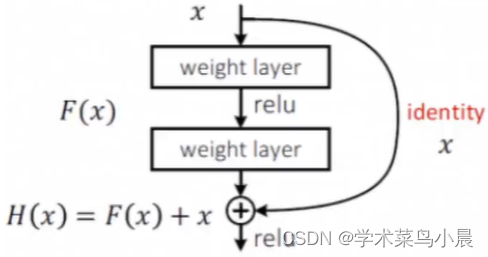 我们还是跟原来一样增加层数,但在此基础上增加残差,也就是如果多的一层网络效果并不比上一层好,那么依然使用上一层的结果,可以看到X直接跳过了两层,这样就能保证了效果一定是越来越好的。