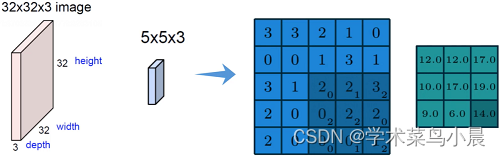 比如一个猫的图,眼睛鼻子特征和周围环境特征的重要性明显不一样,需要区别对待。先把图像进行分割(最左边),分割成多个小区域,提取其中一个小区域(第二个5×5×3),蓝色图的右下角3×3矩阵,大字体的值是X的值,而小字体的值是w权重,会不断循环获取最优的w权重和对应的值,并输出右边绿色的14(特征值)。
