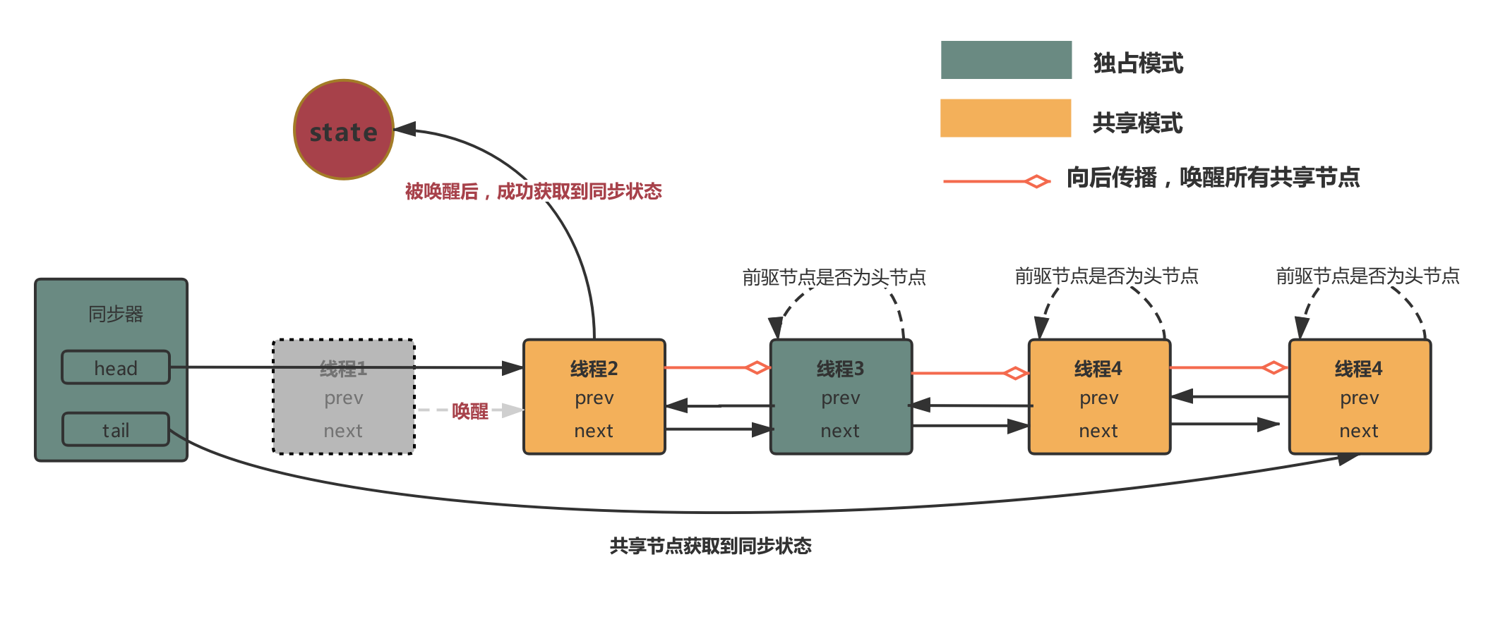 - 共享模式下的节点获取到同步状态或者释放同步状态时,不仅会唤醒后继节点,还会向后传播,唤醒所有同步节点