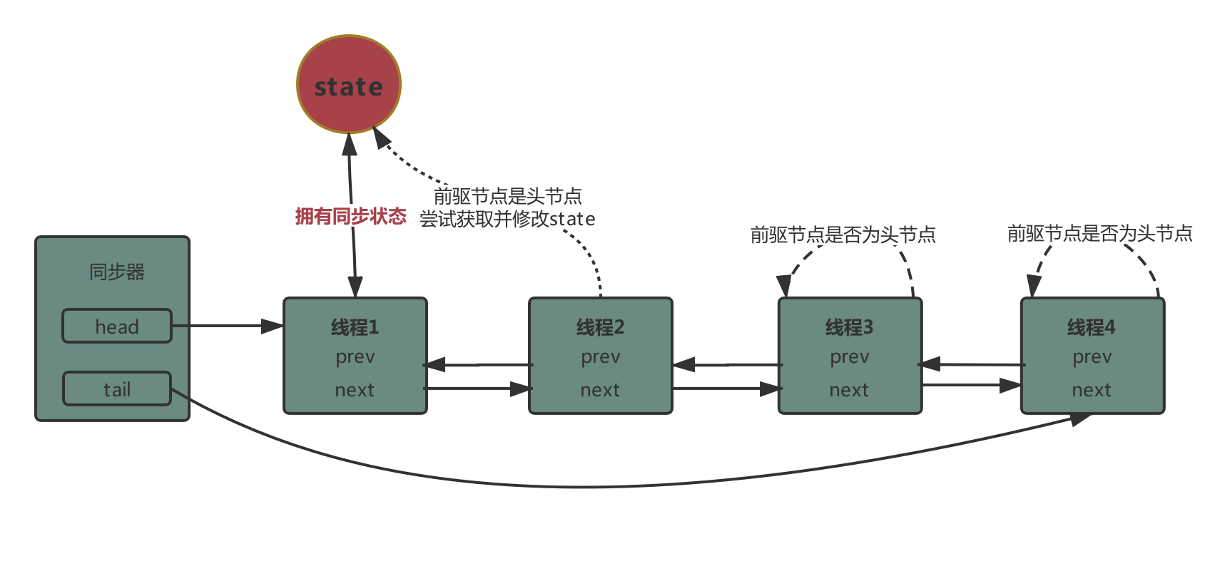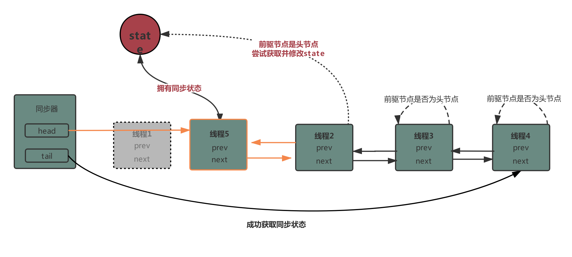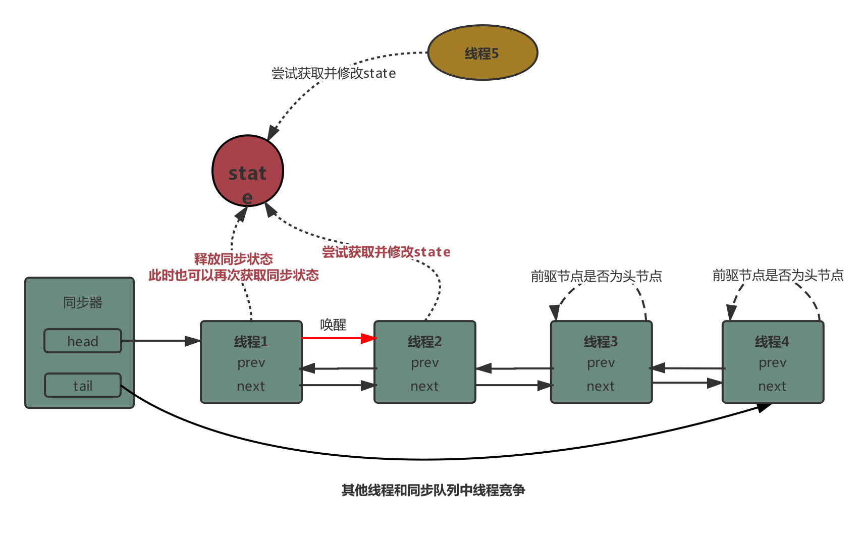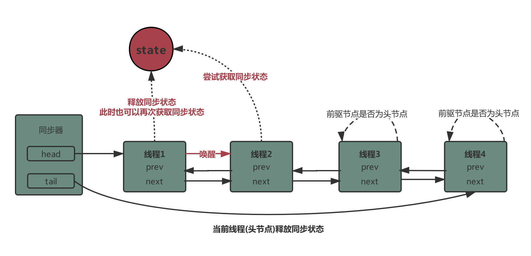 - 当线程释放同步状态,会唤醒后继节点来获取同步状态