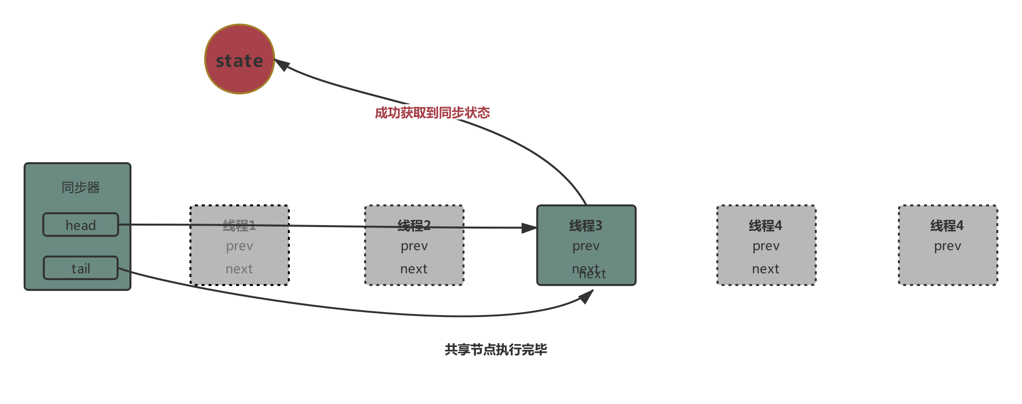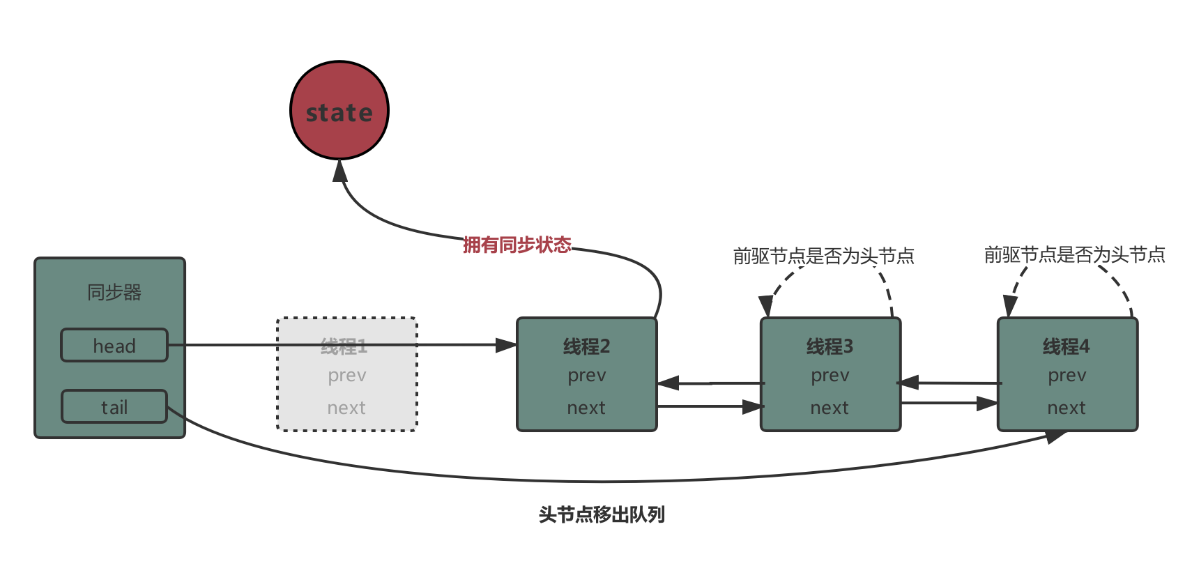 后继节点获取同步状态成功,头节点出队。需要注意的事,出队操作是间接的,有节点获取到同步状态时,会将当前节点设置为head,而原本的head设置为null。