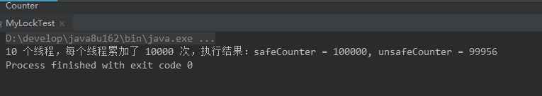 System.out.printf("%s 个线程,每个线程累加了 %s 次,执行结果:safeCounter = %s, unsafeCounter = %s ", threadNum, countPerThread, counter.get(), counterUnsafe.get());