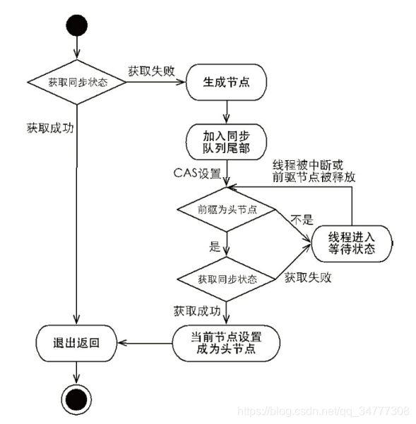 获取失败的线程,加入到同步队列的队尾;加入到队列中后,如果当前节点的前驱节点为头节点再次尝试获取同步状态(下文代码:p == head && tryAcquire(arg))。