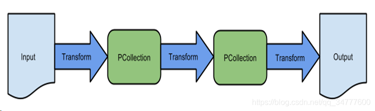 - PTransform:计算过程,代表了将输入数据集处理成输出数据集中间的计算过程,