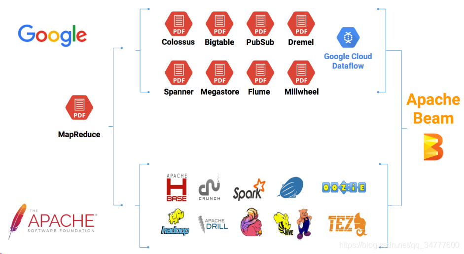 通过上图,我们可以很清晰的看到整个技术的发展流向;一部分是谷歌派系,另一部分则是Apache派系。在开发大数据应用时,我们有时候使用谷歌的框架,API,类库,平台等,而有时候我们则使用Apache的,比如:HBase,Flink,Spark等。而我们要整合这些资源则是一个比较头疼的问题,Apache Beam 的问世,整合这些资源提供了很方便的解决方案。