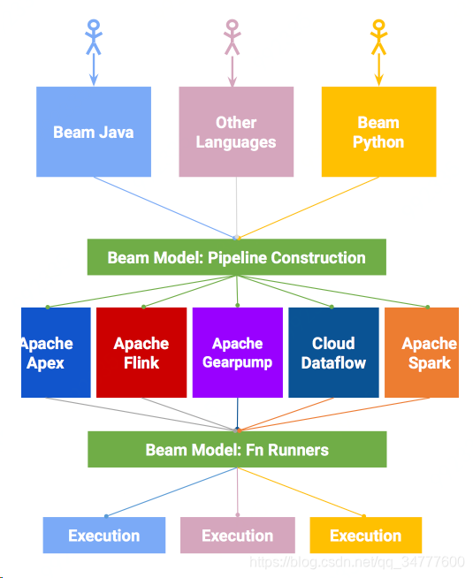- Runner Writers:在分布式环境下处理并支持Beam的数据处理管道