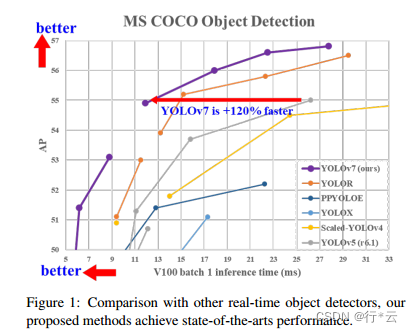YOLOv7在5FPS到 160 FPS 范围内的速度和准确度都超过了所有已知的物体检测器,YOLOv7 在 5 FPS 到 160 FPS 范围内的速度和准确度都超过了所有已知的目标检测器,并且在 GPU V100 上 30 FPS 或更高的所有已知实时目标检测器中具有最高的准确度 56.8% AP。YOLOv7-E6 目标检测器(56 FPS V100,55.9% AP)比基于transformer-based的检测器 SWINL Cascade-Mask R-CNN(9.2 FPS A100,53.9% AP)的速度和准确度分别高出 509% 和 2%,以及基于卷积的检测器 ConvNeXt-XL Cascade-Mask R-CNN (8.6 FPS A100, 55.2% AP) 速度提高 551%,准确率提高 0.7%,以及 YOLOv7 的表现优于:YOLOR、YOLOX、Scaled-YOLOv4、YOLOv5、DETR、Deformable DETR , DINO-5scale-R50, ViT-Adapter-B 和许多其他物体探测器在速度和准确度上。 此外,我们只在 MS COCO 数据集上从头开始训练 YOLOv7,而不使用任何其他数据集或预训练的权重。 源码发布在: https://github.com/WongKinYiu/yolov7