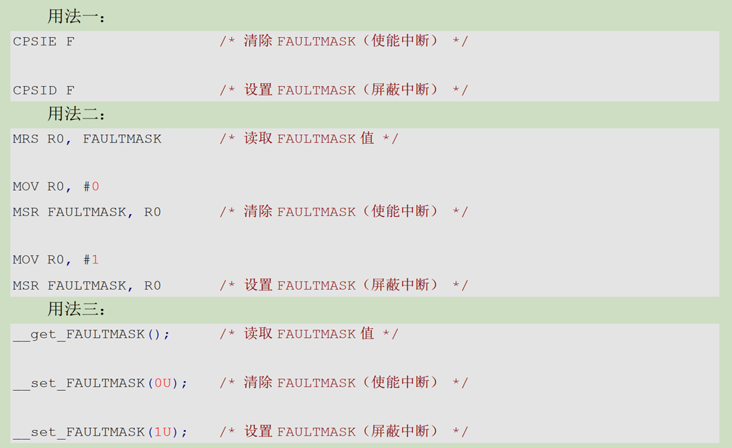 作用: FAULTMASK 寄存器有 32bit,但只有 bit0 有效, 也是可读可写的,将 FAULTMASK寄存器设置为 1 用于屏蔽除 NMI 外的所有异常和中断,将 FAULTMASK 寄存器清零用于使能中断。