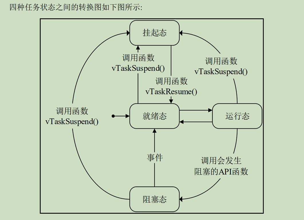 FreeRTOS 中任务存在四种任务状态,分别为运行态、就绪态、阻塞态和挂起态。