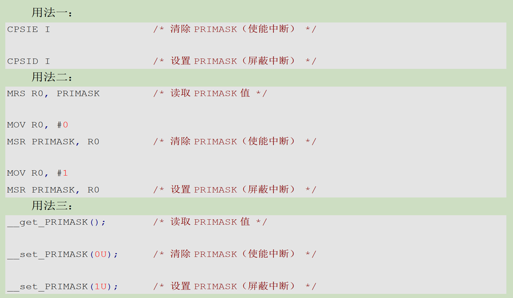ARM Cortex-M 有三个用于屏蔽中断的寄存器,分别为 PRIMASK、 FAULTMASK 和BASEPRI,下面就分别来看一下这三个寄存器的作用。