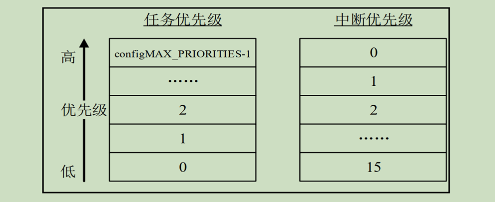 FreeRTOS 的任务优先级高低与其对应的优先级数值,是成正比的,也就是说任务优先级数值为 0 的任务优先级是最低的任务优先级,任务优先级数值为(configMAX_PRIORITIES-1)的任务优先级是最高的任务优先级。 FreeRTOS 的任务优先级高低与其对应数值的逻辑关系正好与STM32 的中断优先级高低与其对应数值的逻辑关系相反,如下图所示: