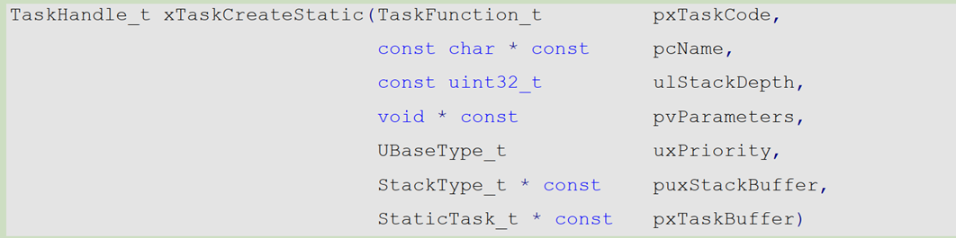 函数中的局部变量、函数调用时的现场保护和函数的返回地址等都是存放在栈空间中的。 对于 FreeRTOS,当使用静态方式创建任务时,需要用户自行分配一块内存,作为任务的栈空间,而使用动态方式创建任务时,系统则会自动从系统堆中分配一块内存,作为任务的栈空间。任务栈大小,实际上是以字为单位的,并非以字节为单位。对于静态方式创建任务的函数 xTaskCreateStatic(),参数 usStackDepth表示的是作为任务栈且其数据类型为 StackType_t 的数组 puxStackBuffer 中元素的个数。