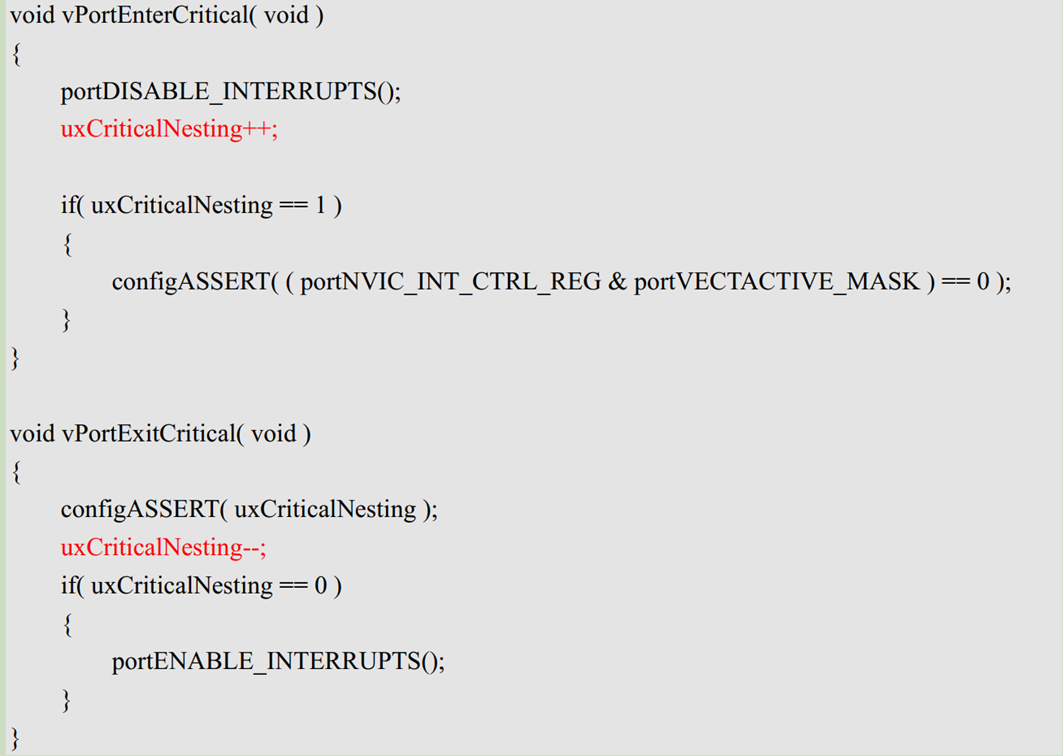 可以看出在进入函数 vPortEnterCritical()以后会首先关闭中断,然后给变量 uxCriticalNesting 加一, uxCriticalNesting 是个全局变量,用来记录临界段嵌套次数的。函数vPortExitCritical()是退出临界段调用的,函数每次将uxCriticalNesting减一,只有当uxCriticalNesting为0的时候才 会调用函数 portENABLE_INTERRUPTS()使能中断。这样保证了在有多个临界段代码的时候不会因为某一个临界段代码的退出而打乱其他临界段的保护,只有所有的临界段代码都退出以后才会使能中断!(带ISR的就是用在中断服务函数的)