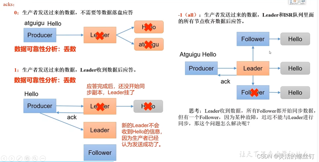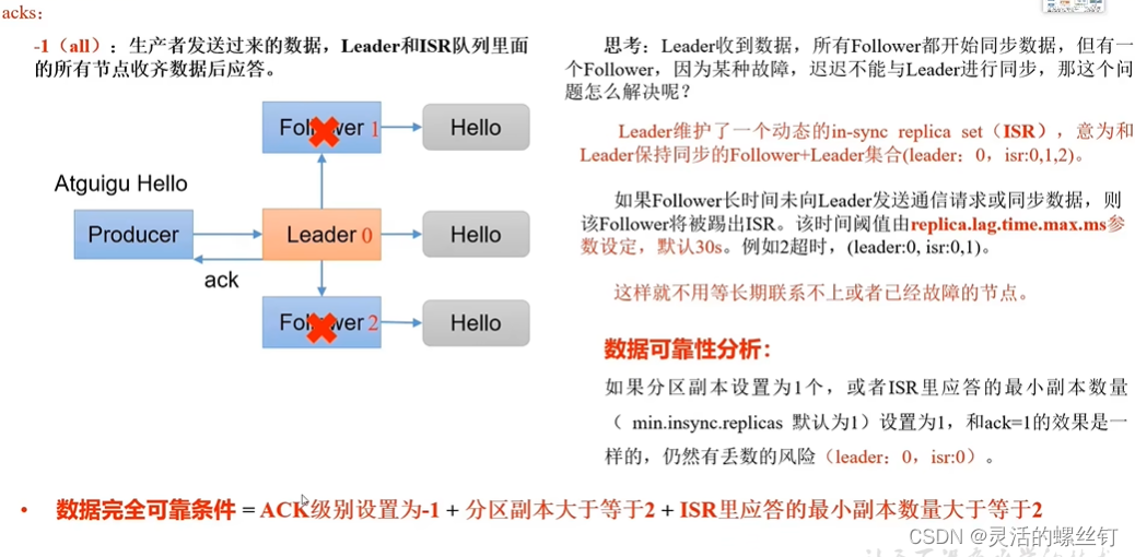 ISR:Leader维护了一个动态的in-sync replica set (ISR),意为和Leader保持同步的Follower+Leader集合(leader:0, isr:0,1,2)如果Follow长时间未向Leader发送通信请求或同步数据,则该Follower将被踢出ISR。该事件阈值由replica.lag.time.max.ms参数设定,默认30s