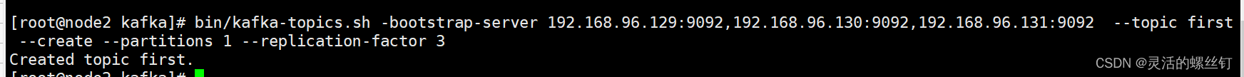 创建topic:bin/kafka-topics.sh -bootstrap-server 192.168.96.129:9092,192.168.96.130:9092,192.168.96.131:9092 --topic first --create --partitions 1 --replication-factor 3