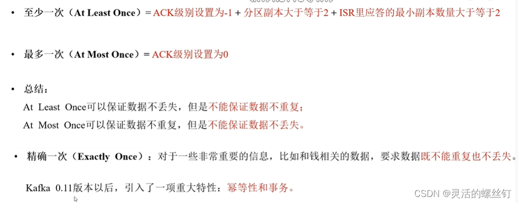 精确依次(Exactly once) = 幂等性+至少一次(ack=-1 + 分区副本数>=2 + ISR最小副本数>=2)
