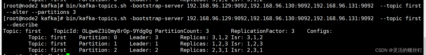 修改分区数(分区数只能增加):bin/kafka-topics.sh -bootstrap-server 192.168.96.129:9092,192.168.96.130:9092,192.168.96.131:9092 --topic first --alter --partitions 3
