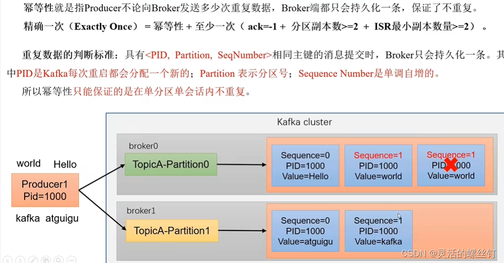 幂等性原理:(kafka幂等性只能保证在单分区、单会话【pid】内数据不重复)