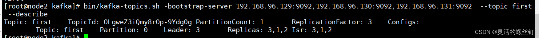 查看topic:bin/kafka-topics.sh -bootstrap-server 192.168.96.129:9092,192.168.96.130:9092,192.168.96.131:9092 --topic first --describe