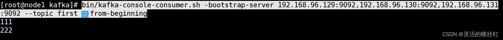 消费数据:bin/kafka-console-consumer.sh -bootstrap-server 192.168.96.129:9092,192.168.96.130:9092,192.168.96.131:9092 --topic first