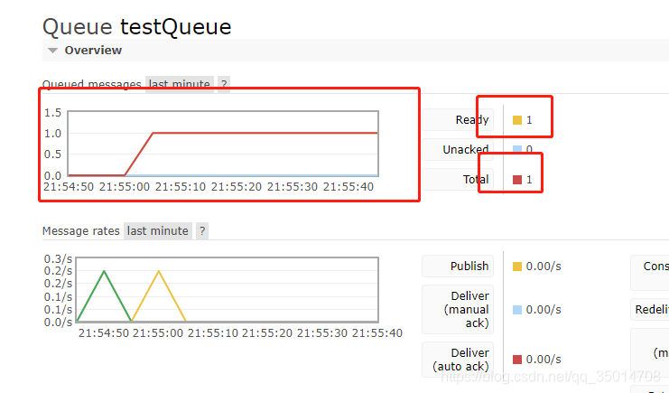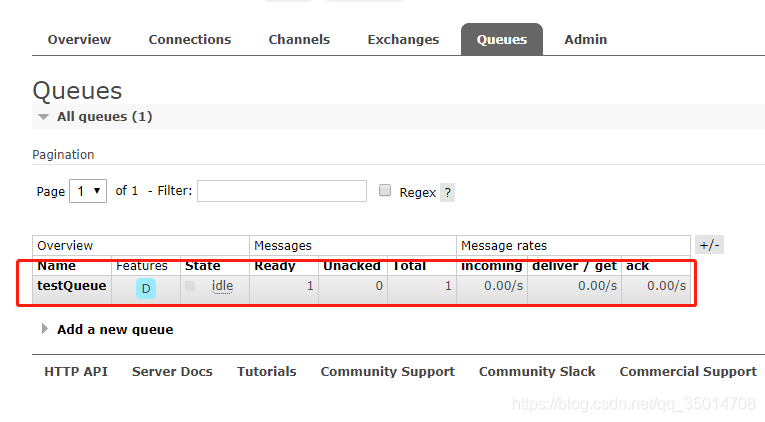 打开mq后台 http://127.0.0.1:15672/ 看到新增队列,接受一条消息