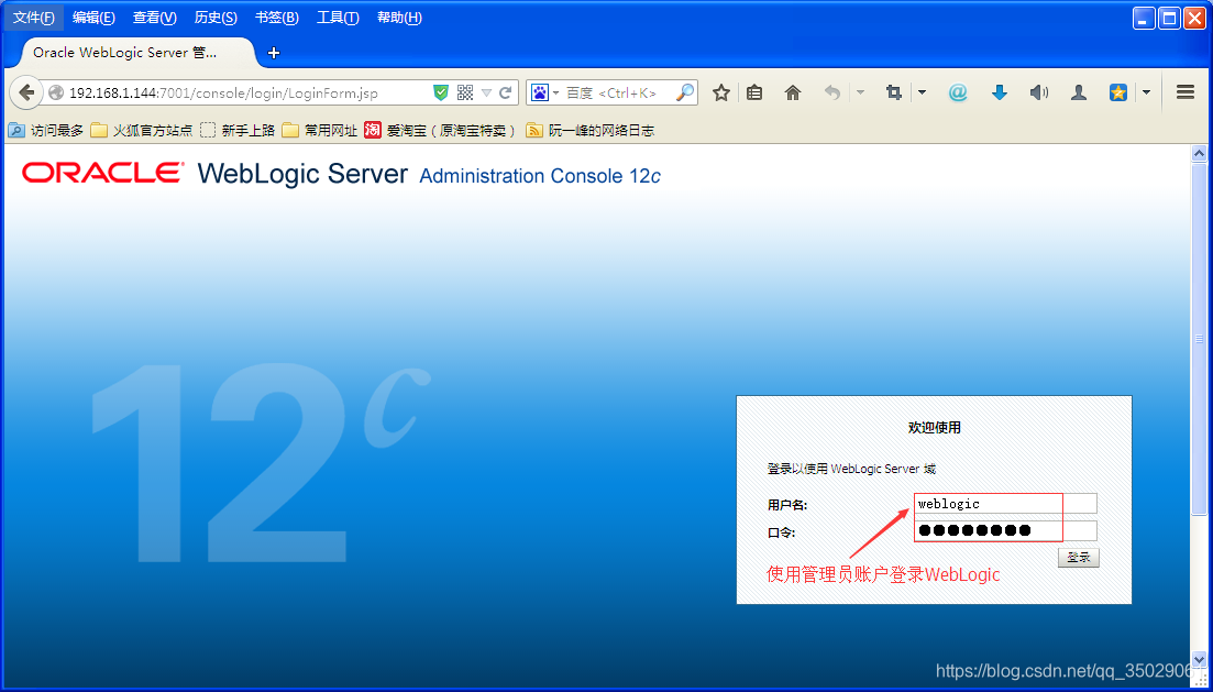 前面我们已经将WebLogic的监听端口改为80端口了,所以登录WebLogic的控制台时使用"http://Ip地址/console"进行登录,例如:http://192.168.1.144/console,如下图所示: