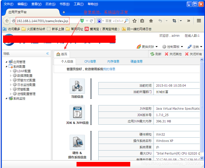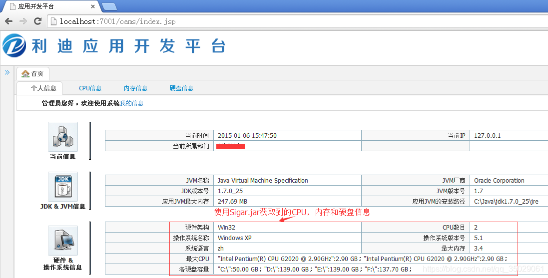将"sigar-amd64-winnt.dll"和"sigar-x86-winnt.dll"放到jdk的bin目录下之后,重启WebLogic服务器,此时就可以正常使用sigar.jar获取获取到Window平台下的cpu使用率、内存使用率和硬盘信息这些信息了,如下图所示: