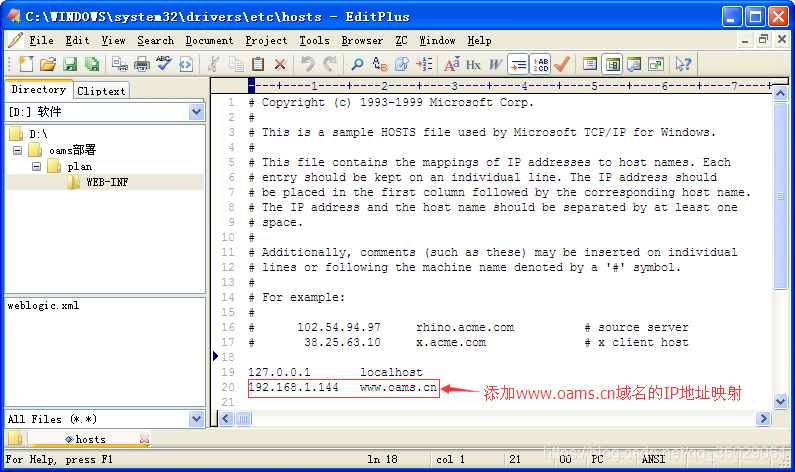 使用文本编辑器打开hosts文件,添加对www.oams.cn这个域名的IP映射,如下图所示: