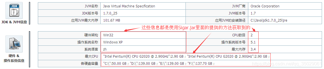 可以使用sigar获取到Window平台下的cpu使用率、内存使用率和硬盘信息这些信息的,如下图所示: