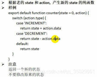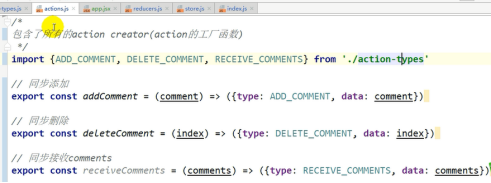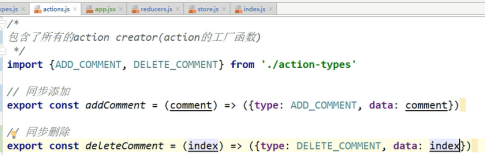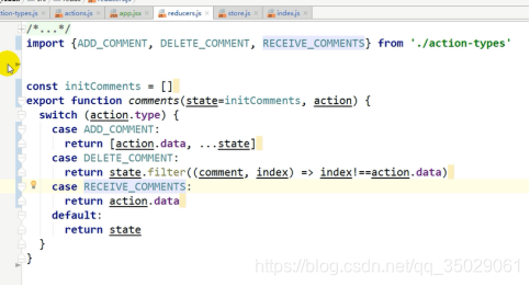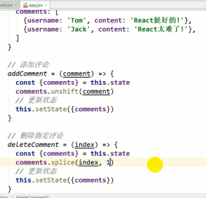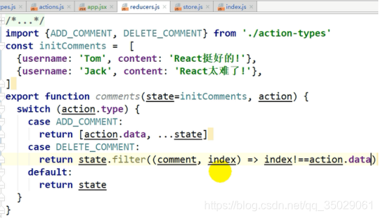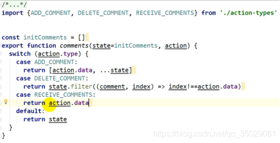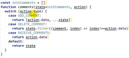 返回新的状态也是一个数组,不能直接修改state,action.data是comment对象,后面原理状态在老状态新增加data。Action.data是一个下标状态要变了,要返回一个数组filter不改变以前数组,新数组比以前的数组少一些元素。