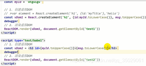 const vDOM2 = <h3 id={myId.toUpperCase()}>{msg.toLowerCase()}</h3>