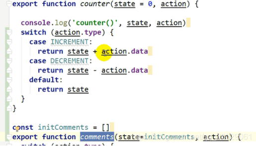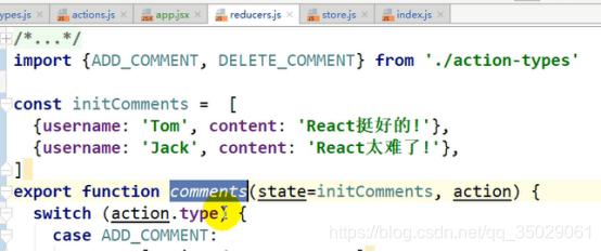 操作评论数组,以操作的数据命名,state要指定默认初始值,switch写法比较固定,default是在第一次的时候调用