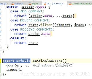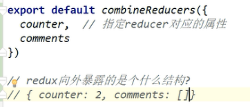 把所有函数的export去掉,统一暴露,combineReducers也是一个函数结果,两个方法名,最好同名,不同名冒号。State是一个对象里面有对应的2和[]数组对应返回状态的结果