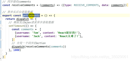 一上来应该是一个空数组,actions中增加异步获取数据的action,dispatch写异步代码模拟发送ajax请求,分发一个同步的action接收数据,action不能自己创建需要同步函数创建