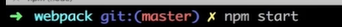 处理app.js入口文件,在package.json中找到script,输入npm start命令执行webpack命令