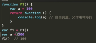 闭包对自由变量进行保护找父级作用域,闭包使用场景函数作为返回值和函数作为参数传递,全局作用域与局部作用域没有任何关系,一个函数父级作用域是它定义时的作用域不是执行时的作用域,定义的时候就是var a=100。