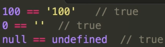 字符串拼接类型转换,双等于把100转为字符串100 ,0和空字符串,null和undefined都会转为false,三等不会出现问题。