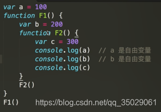 F2在F1中定义,F2的父级作用域是F1。自由变量会去父级作用域找,如果找不到继续向上找,