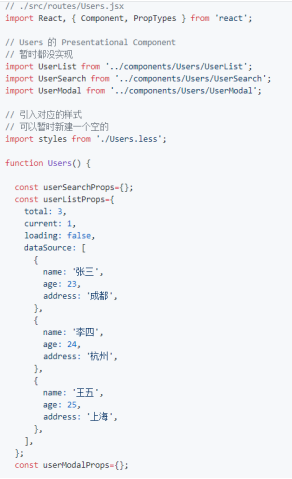 Users Container 的表现为 Route Components(这也是 dva 推荐的结构划分),可以理解页面维度的容器