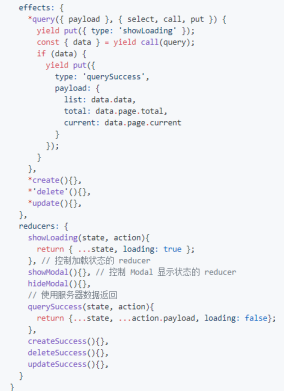 除了 type 以外,其它对象中的参数随意定义,都可以在对应的 reducers(effects)中获取,从而实现消息传递,将最新的数据传递过去更新 model 的数据(state)。