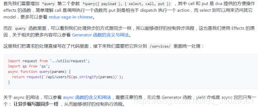其中 call 和 put 是 dva 提供的方便操作 effects 的函数,简单理解 call 是调用执行一个函数而 put 则是相当于 dispatch 执行一个 action,而 select 则可以用来访问其它 model