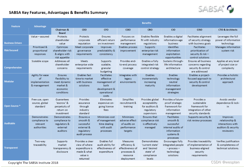 SABSA是一种行之有效的方法,可用于在企业和解决方案级别上开发可支持业务目标的业务驱动型,针对风险和机会的安全架构。