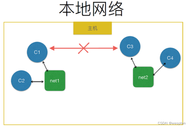 首先我们看一个本地网络的图,这个图中有一台主机,上面跑了四个容器,分别分布在两个网络里面,一个是NET1,一个是NET2。NET1里面的两个容器是可以互相通过自己的IP通信的,但是NET1里面的容器和NET2里面的容器又是隔离的,这样就是Docker的一个网络概念。