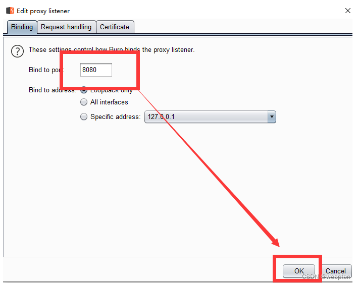 1. 打开burpsuite工具,在proxy中的Option下,看到对应的Interface为127.0.0.1:8080。