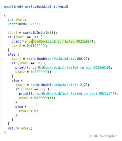这里可以看到uVar2作为返回值,首先进行sockLib库的初始化,失败了会打印相应的错误,并将uVar2设置为0xFFFFFFFF,下面同理,sockLibAdd实际上就是在根据用户的需要初始化bsdSockLib。只有当所有步骤都成功了才将uVar2置为0。