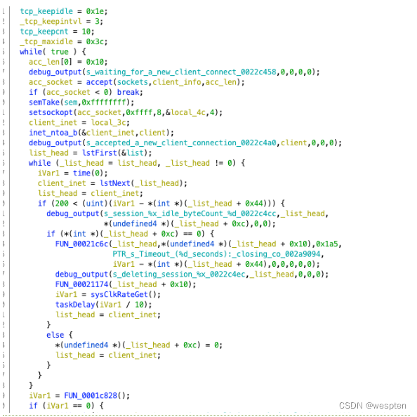 我们可以点进去简单看一下,首先是一堆变量的初始化,有常见的keepintvl、keepidle等等,都是tcp传输中的重要选项,往下则是一个大的while循环,里面还嵌套了一个循环。我们按照逆向循环的一般思路,首先找到循环变量,这里第一个循环是死循环,但是子循环中list_head在一直在通过lstNext在迭代,同时client_inet就等于list_head,也在同步迭代。并且每次拿到拿到client_inet后会做一定的处理。