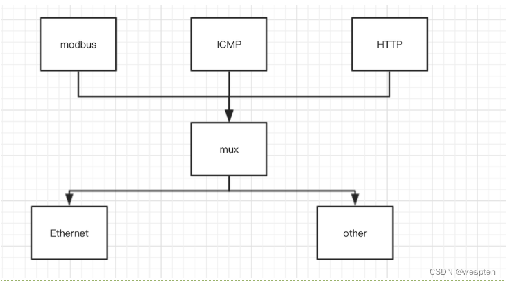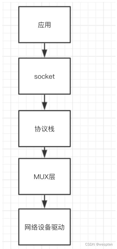 在这两种网络驱动的基础上,到了我们的MUX层,虽说是MUX向上对接协议栈,但要注意,我们所说的协议栈往往是不包括链路层和物理层部分的,这一部分我们更愿意将其视为驱动和设备要完成的功能,我们的协议栈是纯软件的协议栈,如果非要拿TCP/IP来说的话,我们的MUX更像是插在了网络层和链路层之间,如下图所示: