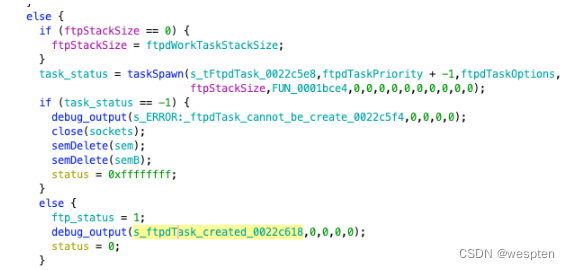 然后会调用taskSpawn函数来创建新的任务,这个函数我们之前已经说过了,第六个函数就是创建的新任务的”main“函数。这里如果调用失败了debug输出错误信息。从这里开始我们就要”多线操作“了,逆向的工作会稍微复杂一点。