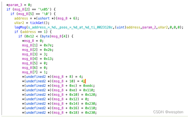 这里检查msg_8的2、5是否为0x5、0x00,如果不是的话直接调用mbus_err_resp__FP9ERROR_RSPUc,返回值固定为0xd,如果是的话则将msg_6作为地址,并用tickGet函数获取时间,打印相关信息。然后根据地址为1或3进行不同的操作,主要是一系列赋值,1的话会返回0x38,3的话为0x18。